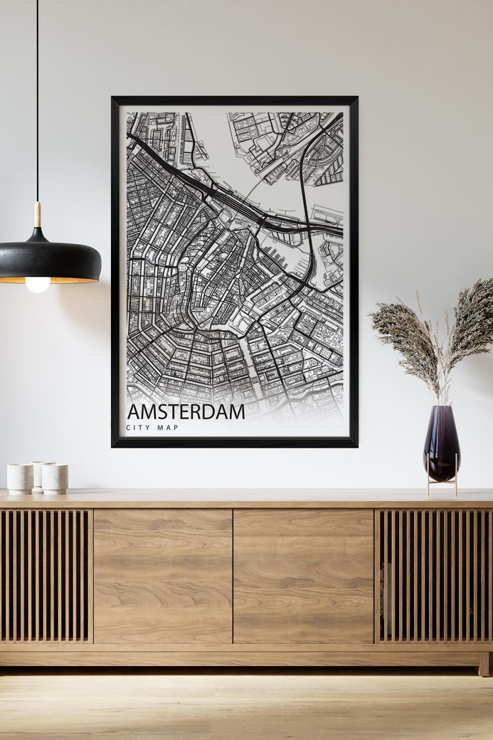 Tek Parça Siyah Çerçeve Görünümlü "Amsterdam Beyaz" Harita Mdf Tablo - ARTAVESSACTYMAP3