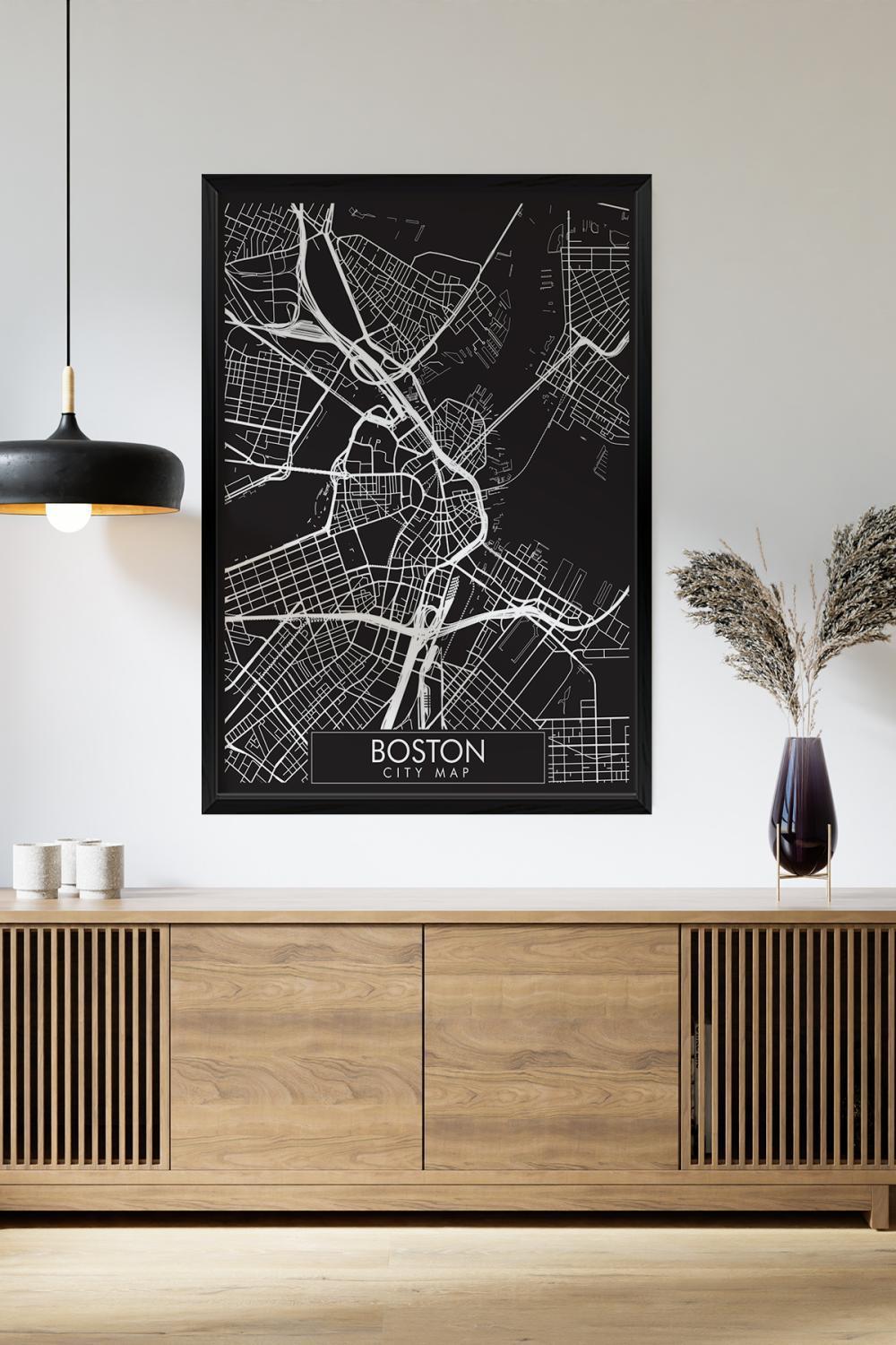 Tek Parça Siyah Çerçeve Görünümlü "Boston Siyah" Harita Mdf Tablo - ARTAVESSACTYMAP10
