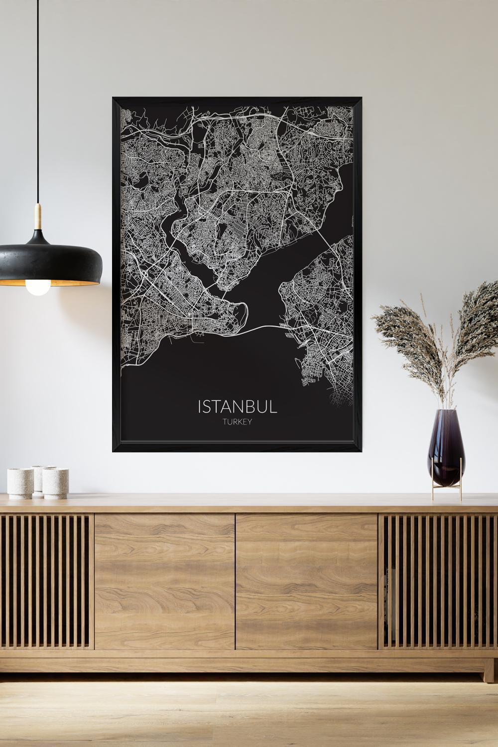 Tek Parça Siyah Çerçeve Görünümlü "İstanbul Siyah" Harita Mdf Tablo - ARTAVESSACTYMAP34