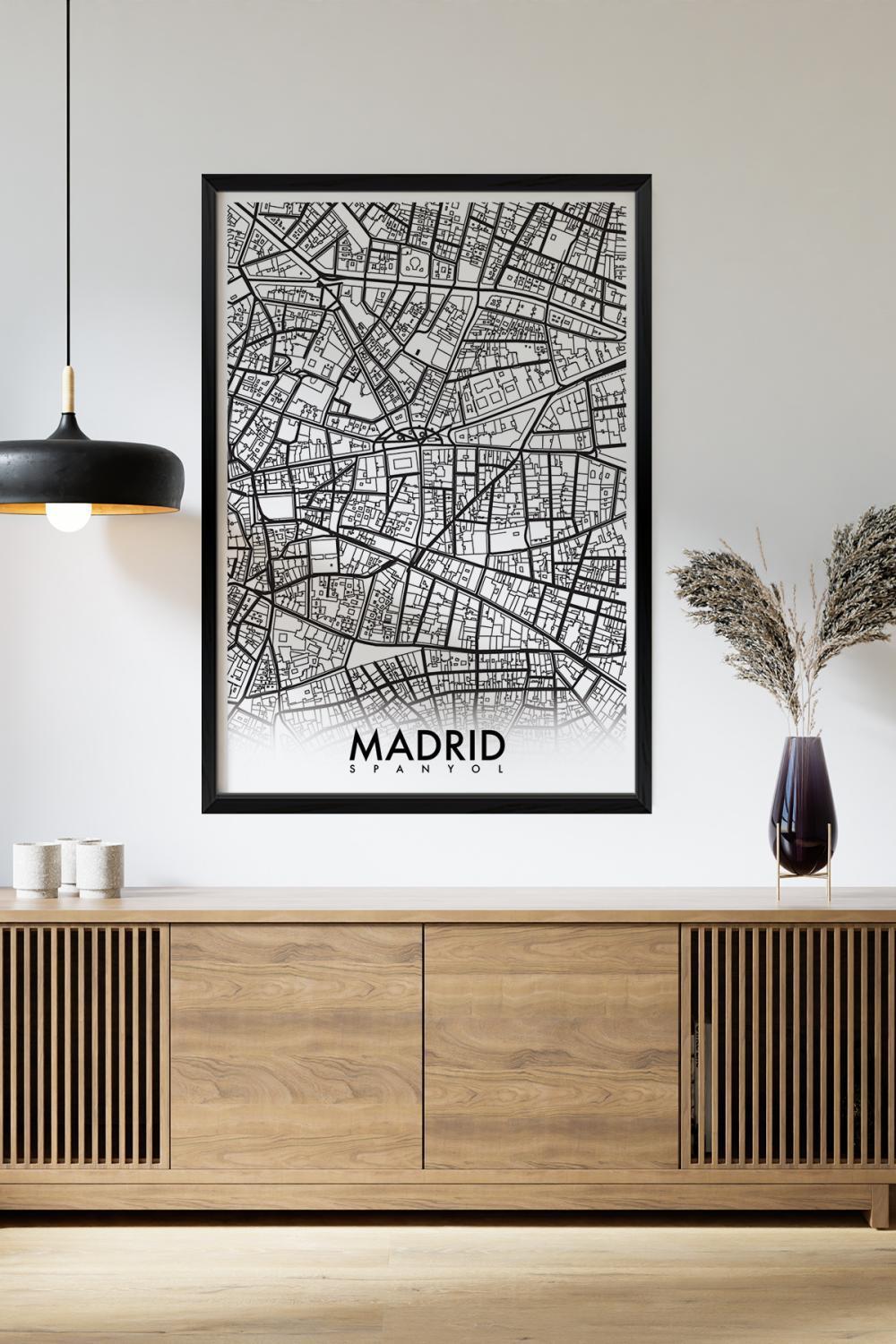 Tek Parça Siyah Çerçeve Görünümlü "Madrid Beyaz" Harita Mdf Tablo - ARTAVESSACTYMAP13